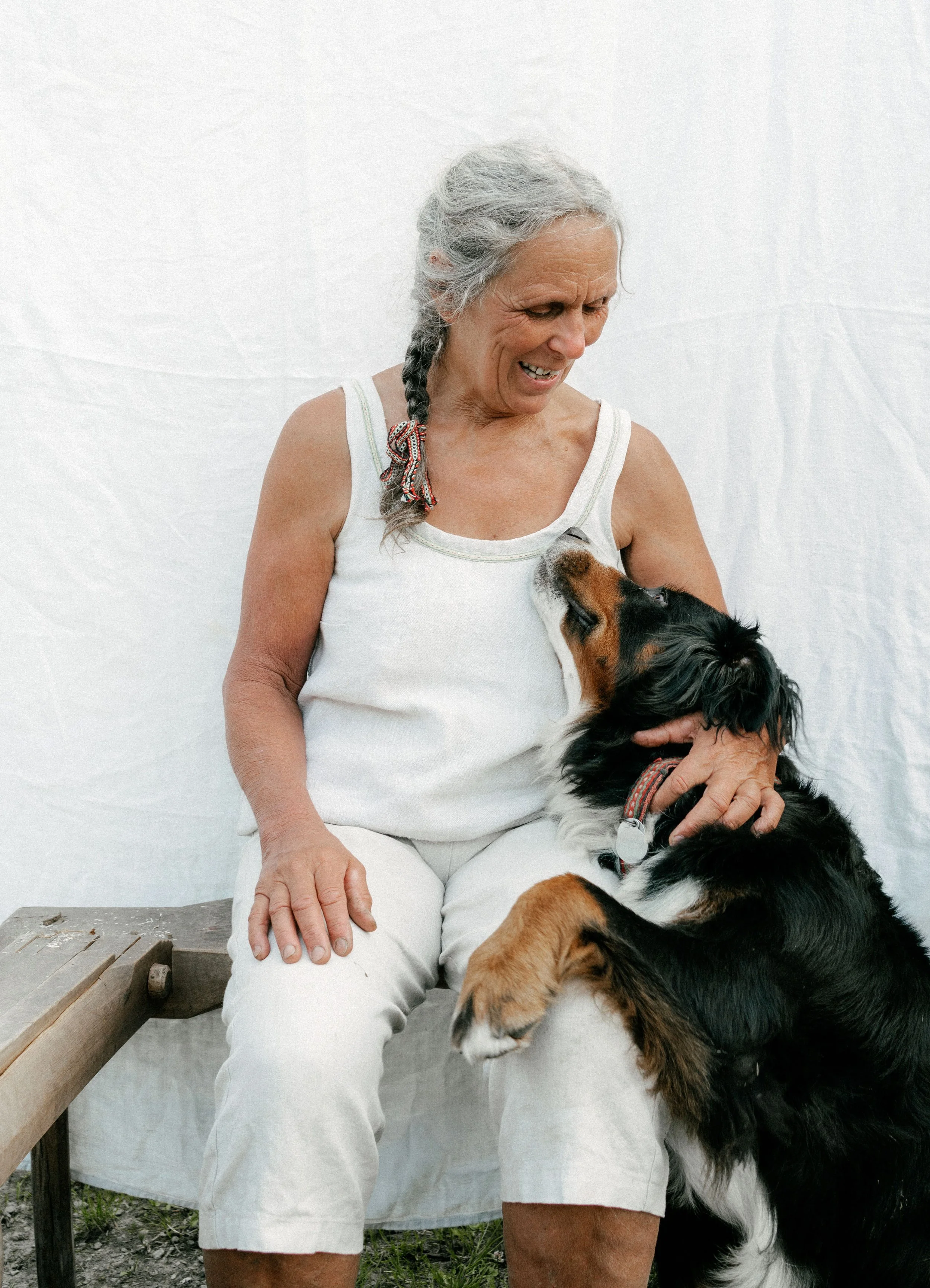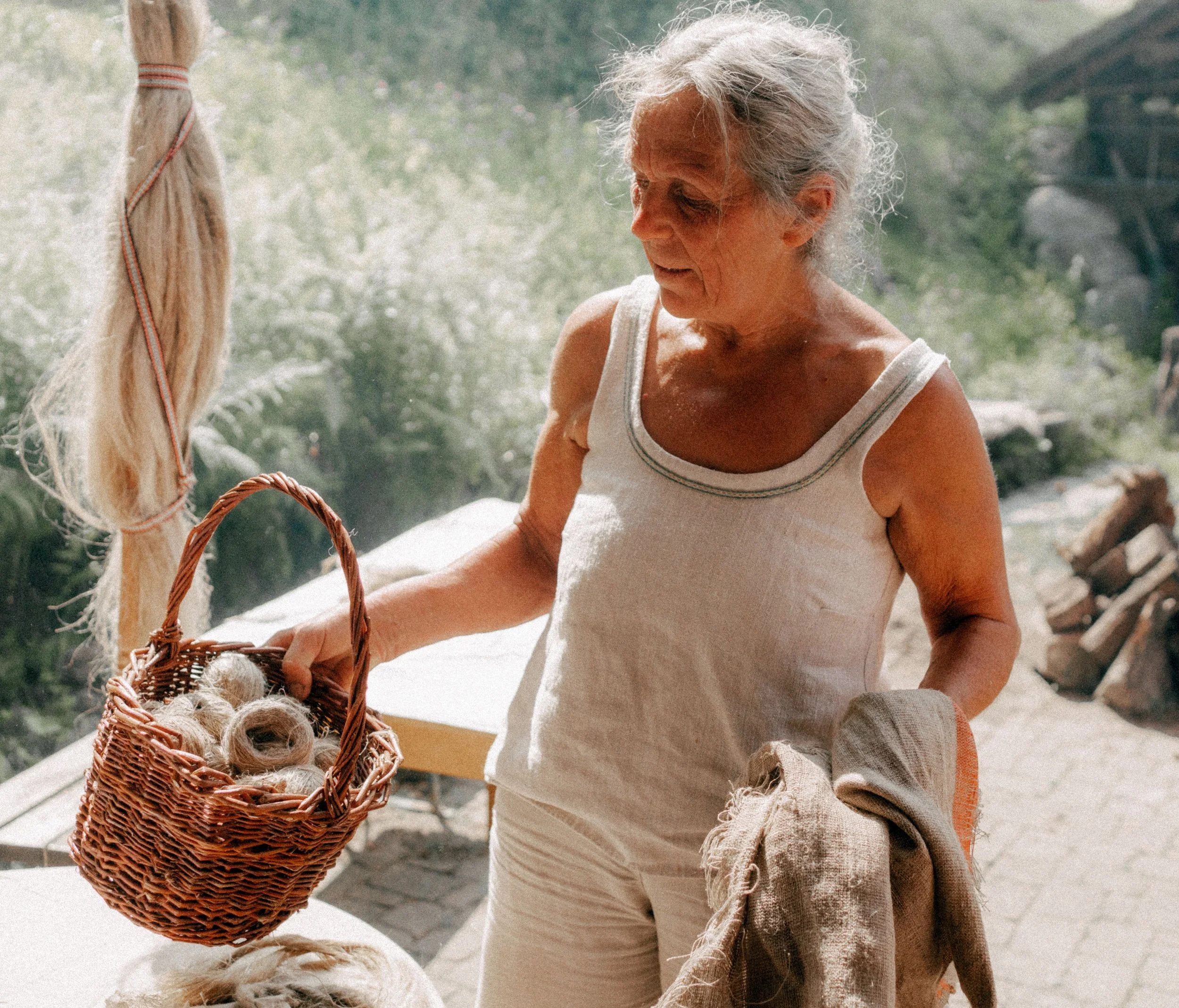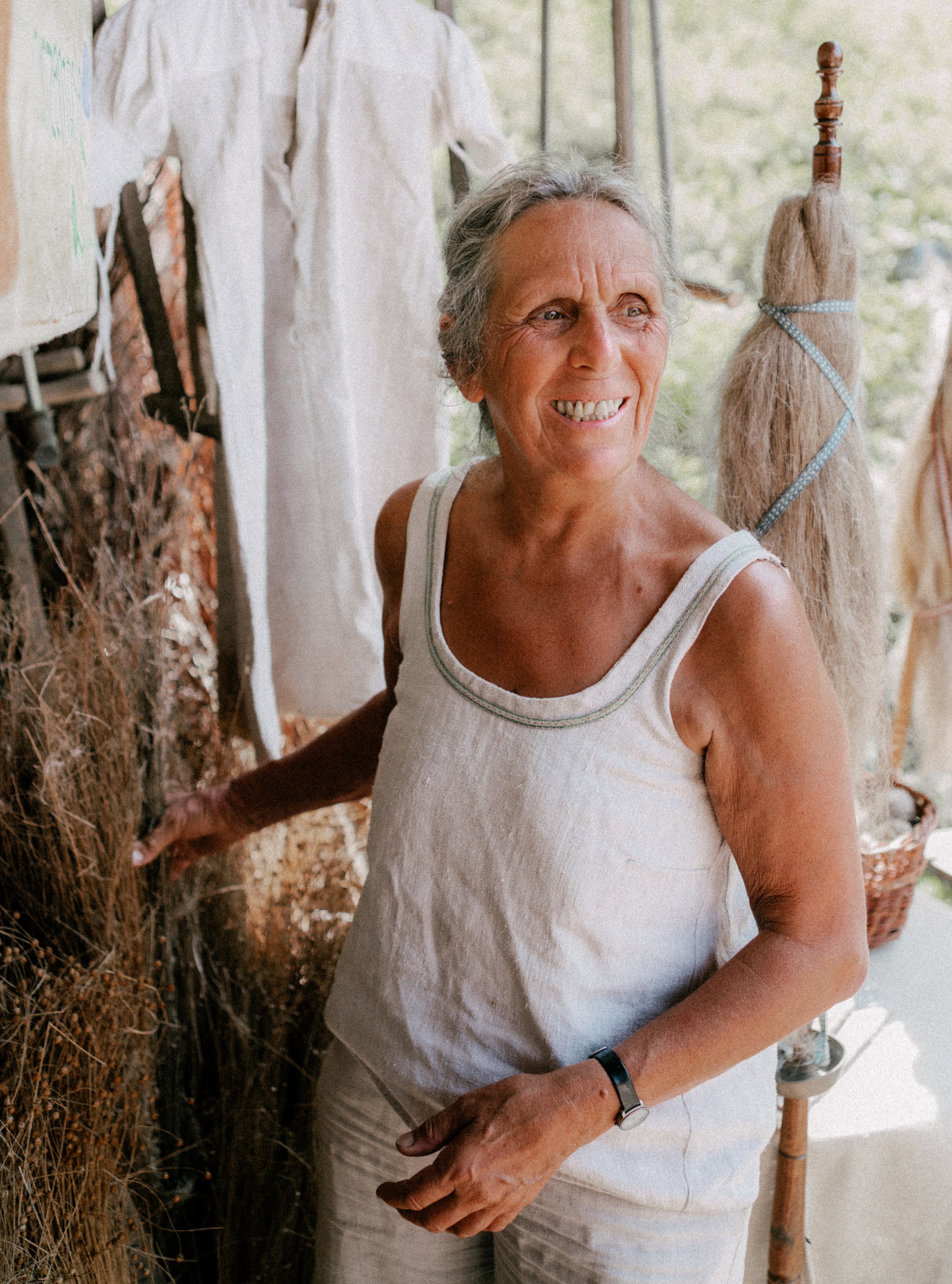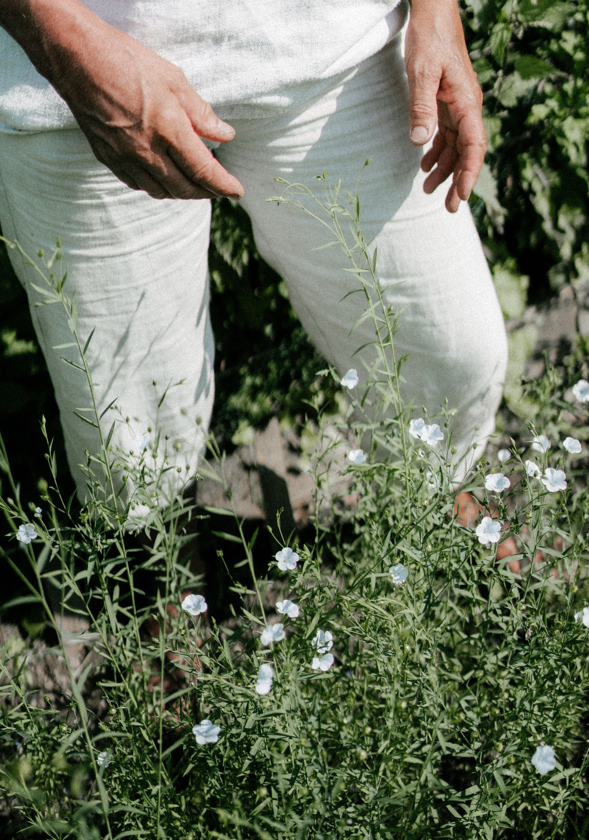 Alles, was Gabriele an diesem Tag trägt, scheint eingebettet in den Kreislauf des Hofs. Helle Leinenkleider bedecken ihren Körper, ihre Haare sind geflochten und mit einem gewebten Haarband zusammengebunden. Ihre Stimme ist hell und klar, durch ihre lebendigen Erzählungen weckt sie in uns eine kindliche Neugierde. Barfuß geht sie voran, und wir kommen auf dem Weg am Komposthaufen vorbei. Sie gräbt Regenwürmer aus der warmen Erde und zeigt sie auf ihren offenen Handflächen. Wir gehen weiter, entlang des kleinen Kieselsteinwegs, vorbei an einer Quelle. Sie ist der Grund, weshalb der Hof hier vor 400 Jahren erbaut wurde, und für Gabriele das kostbarste Kapital. Jahr für Jahr trocknet die Quelle mehr aus. Wir biegen am Haus vorbei in den Kräuter- und Färbergarten ein.
